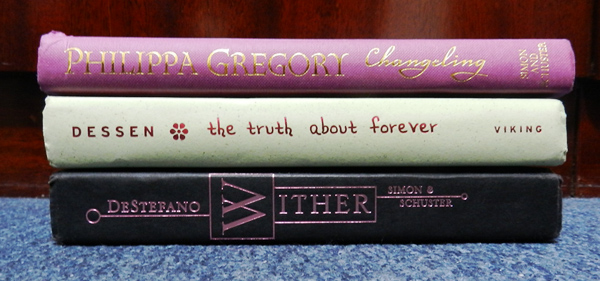 Começando pelos hardcovers - que são os livros em inglês de capa dura. Ignorem que os meus já estão todos meio batidos e o brilho dos títulos não aparece na foto. Gosto muito de Changeling pela cor, é uma mistura de roxo com dourado que eu não vi em nenhuma outra capa, mas ficou maravilhosa aqui! O charme de The Truth About Forever, além da cor fofa, está na fonte do título, que eu achei uma gracinha. O mais bonito de Wither é a maneira como arrumaram as partes da lombada para que ficassem parecidas com a capa. Adorei essas linhas em volta do texto.