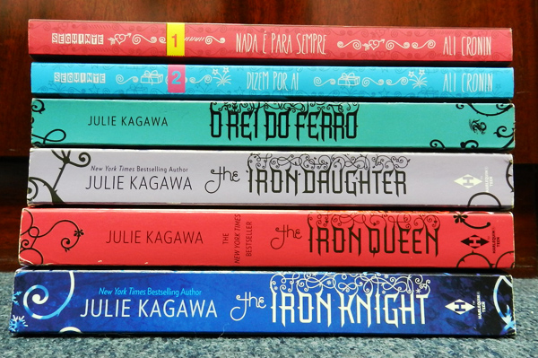 Além de terem cores diferentes para cada livro, as lombadas da série Garota <3 Garoto são cheias de desenhos e detalhes fofos. Minhas prediletas, entretanto, são da série The Iron Fey, porque adoro aquelas curvas nas pontas do livro e sobre o título, além de as cores de cada livro serem maravilhosas!