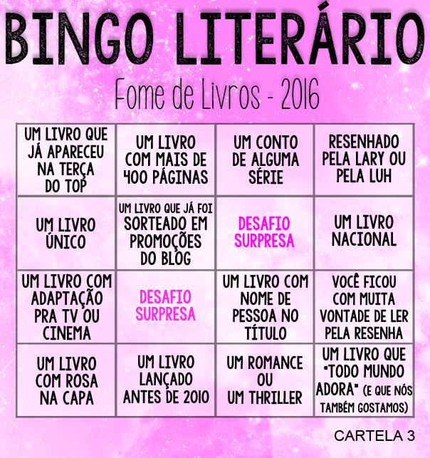 *A maioria dos desafios têm a ver com o blog Fome de Livros. Em desafios como "livro que recebeu nota máxima", "apareceu na quinta das capas", "apareceu na terça do top" e etc, vocês deverão pesquisar livros que apareceram nessas categorias/colunas aqui no blog.