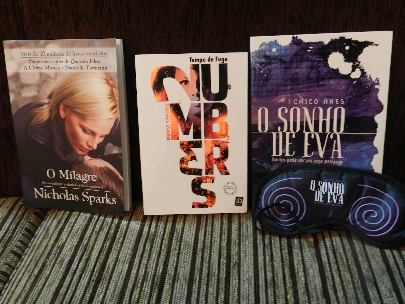 Numb3rs (Rachel Ward - iD) eu recebi de uma troquinha no Skoob. Eu passei por um período onde troquei mais de 15 livros em um só mês, então estava com muitos créditos acumulados e agora estou aproveitando para diminuir minha lista de desejados. Depois chegou O Milagre (Nicholas Sparks - Agir) , que eu ganhei da editora Agir em uma promoção no twitter, me senti muito sortuda! O último foi o kit de O Sonho de Eva (Chico Anes - Novo Conceito), que é muito bonito e veio com aquele tapa-olhos para dormir que a minha mãe adorou, e eu ganhei na promoção do My Literary Life!