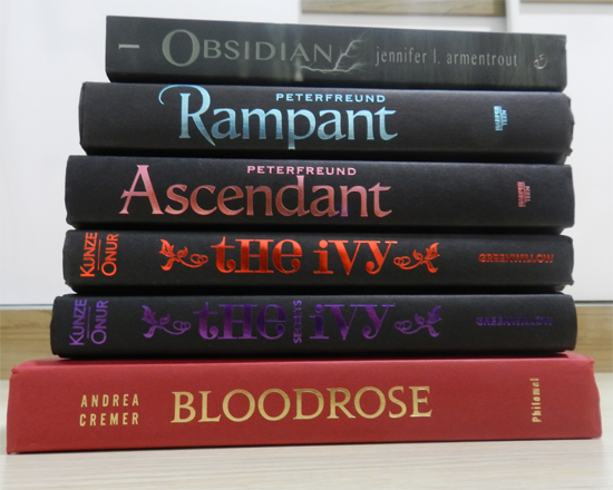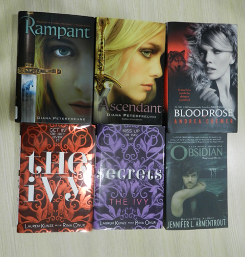 Eu não sei se você reparou, mas todos os livros (ok, menos Obsidian) são hardcover. Eu acho meio desconfortável ler um HC, mas eles ficam tão bonitos na estante que é difícil resistir! Rampant e Ascendant (Diana Peterfreund) são da mesma autora de Sociedade Secreta. Eu estou lendo Rampant essa semana e adorando, lá pela quarta deve sair a resenha. É um livro sobre unicórnios... mas eles são malvados e ficam tentando matar as pessoas. Criativo, hum?