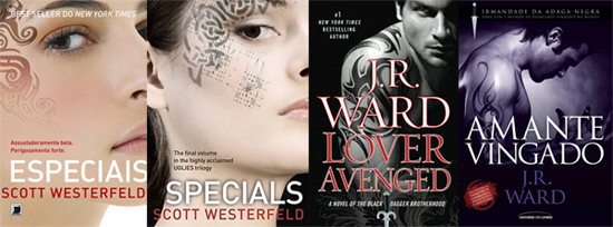 Resolvi fazer uma pequena comparação entre duas capas americanas e duas nacionais, mas já aviso que gostei de todas elas. Ainda não li nenhum dos livros, mas infelizmente as duas capas americanas "ganham" pra mim. A tatuagem de Especiais, apesar de ser bonita, ficou muito falsa com aquele efeito transparente. Talvez se fosse de uma corzinha fraca, ficaria melhor. Já em Specials acho que eles acertaram, as marcas se encaixaram muito bem no rosto da modelo.