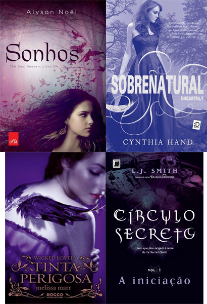 Uma imagem que tinha tudo para me conquistar, mas não conseguiu, foi Sobrenatural. Eu acho que a cor ficou clara demais e a modelo com aquele vestido bonito não combinou nem um pouco com o fundo, a única coisa que eu gostei ali foi o título. Por último temos Círculo Secreto, A Iniciação, onde meu 'elemento' predileto da imagem também é o título, aquela fonte combinou demais! Foi uma coisa boa terem deixado essa capa de uma cor só, especialmente roxo que chama a atenção, porque se não a capa seria bem fraquinha.