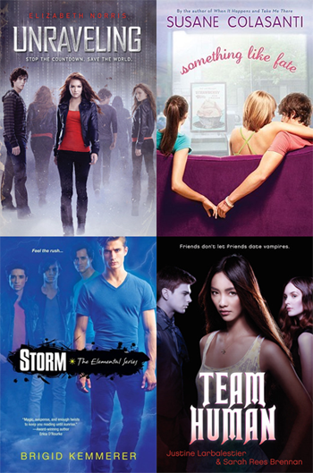 Adoro essa capa de Unraveling, é misteriosa e a modelo da frente é bem bonitinha, além de a cor do nome da autora ter dado um toque especial. Também sempre fico me perguntando porque estão todos com roupas tão parecidas. Something Like Fate é legal porque já fica claro qual o tema do livro, mas sem mostrar o rosto dos personagens ou revelar muito, o nome em forma de arco também ficou legal.