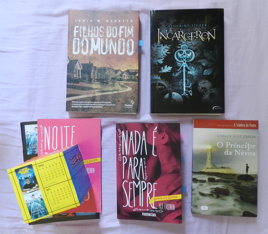 Os livros dessa semana são muito especiais, porque três deles são os primeiros livros que recebemos das novas editoras parceiras. O primeiro a chegar, Filhos do Fim do Mundo (Fábio M. Barreto - Fantasy), foi enviado para resenha pela selo Fantasy da Casa da Palavra. Já terminei a leitura e saiu até resenha essa semana. Em seguida, recebi Nada é Para Sempre (Ali Cronin - Companhia de Letras), o primeiro livro de uma série de seis, e veio com vários mimos, inclusive um calendário em formada de cubo! O livro tem a lombada mais linda da minha estante, cheia de detalhes, e a capa chama a atenção com todo aquele rosa. Como eu estava sem computador, também já o li!