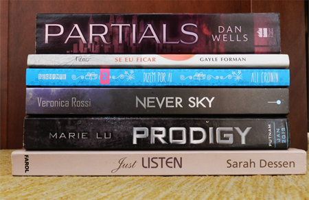 O último livro da minha comprinha do BookDepository, Partials (Dan Wells - iD) é bem maior do que eu esperava, comprei por apenas $5! Pra quem não sabe, se você se cadastrar e colocar livros na sua wishlist, eles avisam por e-mail quando aquele livro entra na promoção! Depois, de uma troca no Skoob, vieram Just Listen (Sarah Dessen - Farol), que vai ser meu primeiro livro da Dessen, e Se Eu Ficar (Gayle Forman - Rocco), um drama bem fininho, mas dizem que é ótimo.