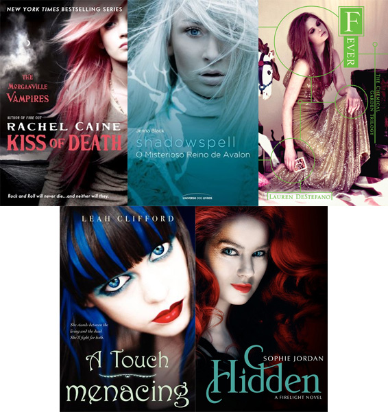 Cabelo rosa! Nem preciso mencionar que a capa de Kiss of Death é muito original e linda, certo? Shadowspell também me surpreendeu, porque o cabelo da modelo é branco! Claro, você deve estar acostumado a ver pessoas de cabelo branco, mas não uma modelo assim tão jovem. Essa imagem me lembra um lugar frio e com neve. Já Fever tem uma capa muito linda, e eu culpo uma mistura de fatores: o vestido, o cenário, a cor escolhida para o título (escolha ousada) e também o cabelo. Nem sei definir se essa cor é rosa ou roxo, só sei que gosto dela!