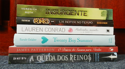 O primeiro livro que recebi foi Um Motim no Tempo (James Dashner - Companhia das Letras). Eu já tinha lido há algumas semanas, mas meu exemplar era uma prova antecipada e agora é o livro normal. Em breve atualizarei a resenha, falando sobre a diagramação. Em seguida, chegou Mentirinhas Inocentes (Lauren Conrad - Galera Record). O livro chegou no sábado e imediatamente comecei a ler os dois da série (eu já tinha o primeiro). Depois chegou um livro que li em inglês ano passado e foi um dos TOP 3 do ano! Insurgente (Veronica Roth - Rocco) faz parte de uma das minhas séries favoritas e logo farei resenha pra vocês! Também estou morrendo para ler A Queda dos Reinos (Morgan Rhodes - Seguinte), que se tornou o favorito de muitos, mas também recebeu algumas críticas negativas. Tive a sorte de conseguir uma prova antecipada e espero que eu goste :)
