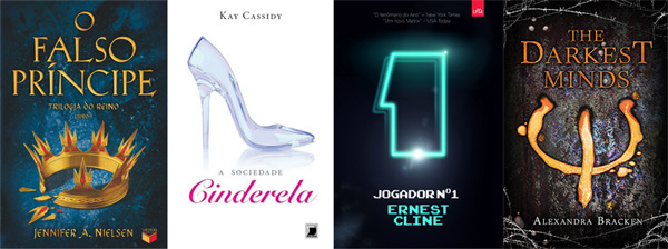 Minha capa predileta de hoje é a de O Falso Príncipe. Sempre amei essa capa, a cor do fundo é linda, a coroa quebrada é muito significativa e os detalhes do título estão ótimos no livro físico. A ideia de colocar um sapatinho de cristal na capa de A Sociedade Cinderela, apesar de não ser extremamente original, foi ótima. Ficou simples, mas muito fofo! Também não li ainda o Jogador Nº 1, só sei que esse 1 gigante me lembra muito o filme Tron! Por fim, estou morrendo de vontade de ler The Darkest Minds, mas ainda não faço ideia do que é aquele símbolo. Parece aquele líquido que os ferreiros usam em filmes da idade média, tipo um fogo líquido, no meio do asfalto? Intrigante.