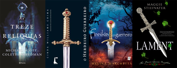 Algumas capas com espadas parecem até cópias, mas outras são muito interessantes e originais!Começando pelos livros com imagens bem similares, dos quatro acima a imagem mais bonita é a de As Treze Relíquias. Realmente parece uma daquelas espadas antigas e, apesar de a capa ser simples, ficou ótima. Não gostei muito de O Herdeiro Guerreiro, porque ficou simples demais, poderia ter um fundo ou o título deveria ser mais enfeitado. Qualquer coisa pra chamar a atenção! Em Finnikin, O Guerreiro, o problema foi o contrário: enfeites demais. Aqueles galhos ficaram bem estranhos e o nome da autora ficou bem escondido, mas gostei do contraste de cores. Por fim, não sei dizer bem o que está errado em Lament, mas também não gostei muito dessa capa. Aquele detalhe lá embaixo, com umas rosas vermelhas, não combinou nada com o resto do livro e o título precisava de uma corzinha, mas gostei daquele efeito da espada atravessando a palavra.