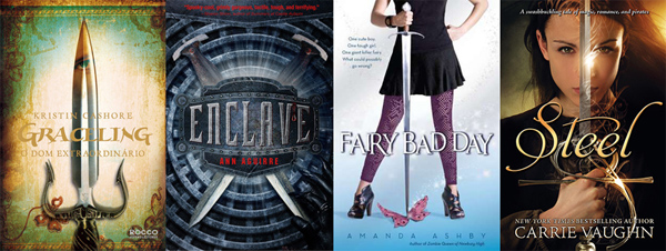 Agora para as imagens mais diferentes! Adoro aquele efeito em que podemos ver algo refletido na espada, como em Graceling, e acho o fundo da capa muito bonito! Apesar de eu preferir algo mais delicado, não posso negar que Enclave ficou legal. Aqueles círculos lembram um escudo, as espadas cruzadas foi uma boa ideia e o vermelho deu um ar mais colorido à capa. A ideia de Fairy Bad Day foi boa, acho que aquilo na ponta da espada era pra ser uma fada, mas não sei se gostei muito da fonte do título. Minha predileta do dia, Steel, ficou maravilhosa. Adorei a modelo, o título ficou perfeito e a imagem me deu vontade de ir correndo comprar o livro!