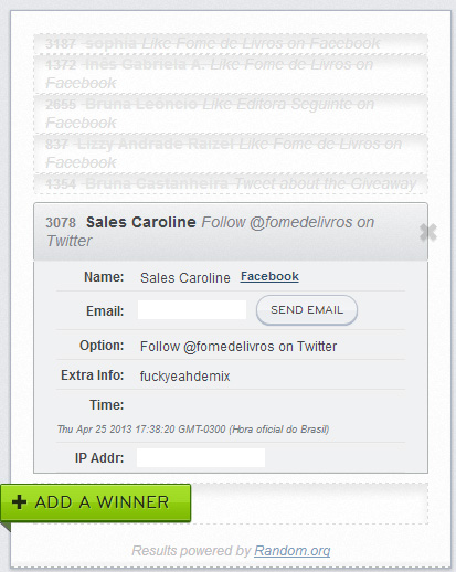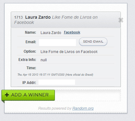 Quero aproveitar para relembrar vocês de dois itens importantes: eu confiro todas as entradas, não só a que aparece quando alguém ganha. Então, cuidado! E se o seu Facebook for bloqueado e eu não conseguir ver se você nos curtiu, será desclassificado da mesma maneira. Muitas das pessoas que ganham só fizeram 1 ou 2 entradas, então não se preocupem tanto com o número de opções que vocês conseguem preencher, ok?