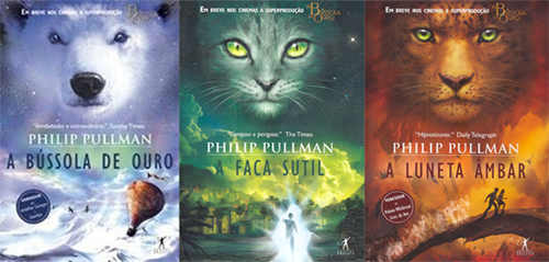 Eu adoro as capas da série Fronteiras do Universo! Eu acredito que os animais combinem com a trama e a ideia de 'dividir' a imagem em dois espaços (antes e após o título) foi muito original. Minha predileta é A Faca Sutil, por causa do gato, mas todas são belíssimas.
