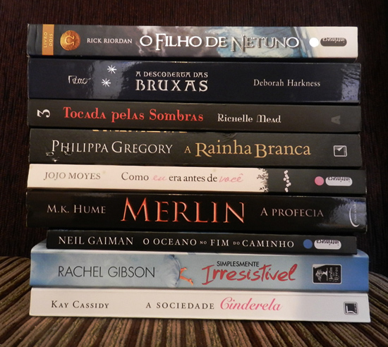 Como já é de costume, os livros não estão exatamente como a pilha que eu tinha planejado no post anterior, mas vocês já devem estar acostumados com isso né?O primeiro livro foi A Sociedade Cinderela, que me decepcionou um pouco por ter uma trama bem 'infantil', e uma protagonista chata. Em seguida foi a vez de Simplesmente Irresistível, que me surpreendeu porque não costumo gostar de romances, mas adorei a escrita da autora. Depois li O Oceano no Fim do Caminho, um lançamento do Neil Gaiman que tem alguns defeitinhos, mas ainda me encantou. Como sou muito fã de Merlin, estava claro que eu ia gostar de Merlin: A Profecia, e realmente adorei alguns aspectos do livro, mas espero que melhore no próximo da série. Como Eu Era Antes de Você foi absolutamente maravilhoso, entrou para os meus favoritos e recomendo a todos! A Rainha Branca foi bom, mas eu esperava um pouco mais da autora, já que ela tem alguns livros que entraram para meus favoritos, e o tema escolhido para esse (A Guerra das Duas Rosas) era maravilhoso. Tocada Pelas Sombras foi uma releitura, mas foi ótimo lembrar porque eu gosto tanto dessa série. A Descoberta das Bruxas foi a maior decepção da pilha, o livro era bom, mas eu esperava muito mais! Em seguida reli O Filho de Netuno, que é super legal e me deixou morrendo de vontade de pegar logo a continuação! Fechei a pilha com The Testing, que não está na foto porque li no kindle, é uma distopia muito parecida com Jogos Vorazes que eu adorei!