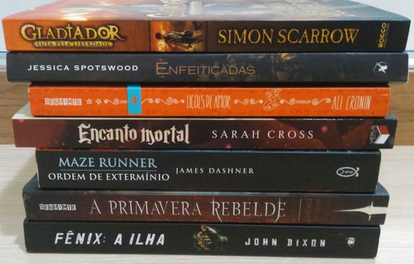 Após muito tempo mudando as pilhas, essa está idêntica à que eu planejei! São 7 livros no total e, como nenhum deles é gigante, consegui ler todos rapidamente. Comecei por Luta Pela Liberdade, que é de um gênero bem diferente e foi sobre os gladiadores na Roma Antiga. Não foi um livro maravilhoso, mas eu gostei. Em seguida Enfeitiçadas me conquistou com sua protagonista corajosa e toda a magia das bruxas. Lições de Amor é o quarto livro de uma série sobre adolescentes e foi meu predileto até o momento, amei a protagonista. Encanto Mortal foi muito melhor do que eu esperava, com uma trama envolvente e até meio sombria, apesar de envolver contos de fada. Por outro lado, Ordem de Extermínio teve uma trama bem inútil e, na minha opinião, não deveria fazer parte da série. A Primavera Rebelde foi interessante, porém a narrativa era confusa demais e o livro acabou não sendo tão bom quanto o primeiro. Por fim, Fênix A Ilha não era nada do que eu imaginava, mas ainda consegui aproveitar o livro.