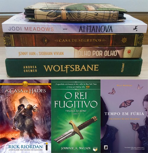 É hora de uma dancinha da vitória, porque finalmente não estou com nenhum livro atrasado. Na verdade, eu fui tão rápida que vou poder ler alguns livros do Kindle! Começando pelos de parceria, Casa de Segredos é um infanto-juvenil que me lembra os livros do Rick Riordan (espero que seja tão bom quanto), Olho Por Olho parece interessante, porém já suspeito que não será um dos meus prediletos, e Almanova tem uma capa tão maravilhosa e uma sinopse tão interessante que estou louca pra pegar logo. Como eu estou lendo rápido e consegui limpar minha pilha de parceria (yay!), estavam planejando pegar 2 continuações de séries, porque estou tentando acabar o máximo de séries possível para poder começar séries novas, mas acho que dá tempo de ler 4. Wolfsbane é o nacional Lua de Sangue, a continuação de Sob a Luz da Lua, e vai entrar na briga por melhor da pilha com certeza. Do outro lado da briga vem A Casa de Hades, que foi o escolhido na votação e já está aguardando há meses no meu Kindle. Se der tempo, entram também O Rei Fugitivo, continuação do ótimo O Falso Príncipe, e Tempo em Fúria, que é o segundo da série Hourglass.