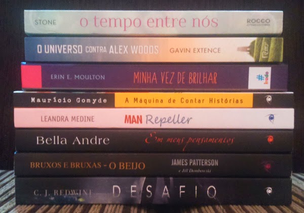 E recebemos também a caixa da Novo Conceito com os lançamentos de julho! O livro que eu mais queria é Desafio (C. J. Redwine), por ser um pós-apocalíptico bem original. Representando os nacionais, tem A Máquina de Contar Histórias (Maurício Gomyde) , das séries que já estão em andamento (e provavelmente não leremos) tem também Em Meus Pensamentos (Bella Andre) e O Beijo (James Patterson). Também recebemos dois livros que parecem ser muito fofos, Minha Vez de Brilhar (Erin E. Moulton), que está com uma edição maravilhosa em capa dura, e Man Repeller (Leandra Medine), que veio embrulhado naquele lenço bonito.