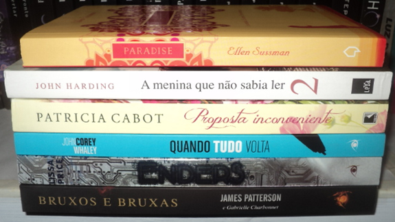 Por enquanto eu acho que essa pilha vai ficar desse jeitinho mesmo, vou me fazer ler os da Novo Conceito de parceria, porque eles estão encalhados aqui há muito tempo, nem que eu tenha que ler dois livros de uma vez. Mas deixa eu falar dos livros. Paradise parece ser um romance com uma pitada de drama, já que a moça perdeu seu namorado em um ataque terrorista e depois volta ao país onde ele morreu para tentar afastar os fantasmas de seu passado. Estou bem curiosa para ler A Menina Que Não Sabia Ler 2, porque nem podia imaginar que teria uma continuação, então estou bem ansiosa para conhecer essa Florence mais velha. Proposta Inconveniente é mais um romance história de Patricia Cabot (aka Meg Cabot), e esse tem a ver com piratas. Nunca li nada da Meg com esse pseudônimo, então estou bem curiosa. Quando Tudo Volta está aqui mais uma vez! \o/ Espero conseguir lê-lo dessa vez, haha. Enders também voltou para pilha, porque eu já disse como estou ansiosa para lê-lo, né? Até hoje não consegui :/ E por último, o vencedor da última votação, que eu tive que substituir na pilha passada. Dessa vez eu leio Bruxos e Bruxas :D (espero :P).