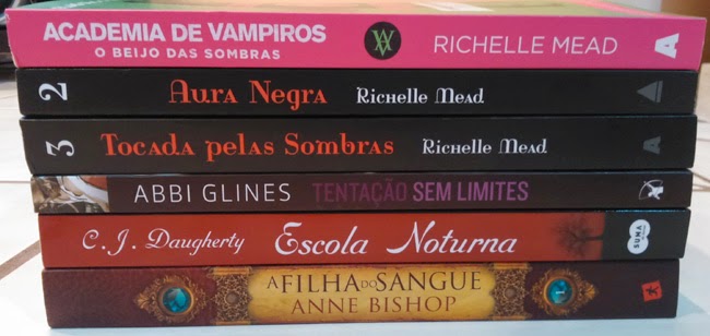 Para começar, a editora Agir nos enviou um pacote com os livros da série Academia de Vampiros (Richelle Mead), que, para quem não sabe, é uma das minhas séries prediletas de todos os tempos. Um livro que eu estava louca pra ler e chegou foi Escola Noturna (C. J. Daugherty - Suma de Letras), que envolve escola e elementos sobrenaturais, duas coisas que eu adoro nas minhas tramas. Por fim, chegaram Tentação Sem Limites (Abbi Glines - Arqueiro), que é a continuação de Paixão Sem Limites, um new adult, e A Filha do Sangue (Anne Bishop - Arqueiro), uma fantasia com bruxas.