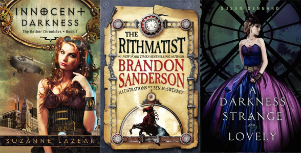 Com o clássico dirigível no fundo, Innocent Darkness me parece um livro que tentou demais. Tenho a impressão de que eles jogaram "steampunk" no Google e usaram tudo o que era possível na capa, sem falar que aqueles brilhos no cabelo estão muito falsos. Por outro lado, The Rithmatist ficou perfeito, amei o cavalo mecânico e as cores, me deixou bem curiosa. A Darkness Strange and Lovely também é bonita sem ser óbvia demais, amei o vestido e o fato de que ela parece estar dentro da torre do relógio, ao invés daquela torre no fundo.