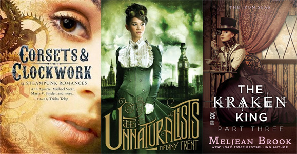 Não sei exatamente o porquê, mas Corsets & Clockwork é linda demais, com aquelas engrenagens meio transparentes e o rosto da modelo tão evidente. Não gostei de The Unnaturalists ser meio "clichê de steampunk", porém o vestido é lindo, a cor é diferente e amei a fonte do título! A imagem de fundo em The Kraken King, entretanto, é ótima, porém não gostei num um pouco da fonte.