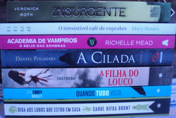 Como vocês devem ter visto, ocorreu um erro no site das enquetes, então não teve como muitas pessoas votarem. Na última vez que eu olhei, Insurgente estava com mais votos, por isso entrou na pilha (mas eu acho que não vou conseguir ler ele agora, pelo menos vou tentar). Também coloquei Quando Tudo Volta na pilha, porque eu tenho que continuar tentando ler esse livro (e todos os da NC que estão aqui). O Irresistível Café de Cupcakes parece ter um romance bem fofo, mas acho que é só um livro pra passar o tempo mesmo. O Beijo das Sombras é o primeiro volume de Academia de Vampiros e tenho muita vontade de ler. A Cilada é a continuação de O Guardião e estou curiosa em relação a esse livro, já que a trama do outro foi concluída. Já estou na metade de A Filha do Louco, então coloquei ele na nova pilha só para conseguir terminar, então pelo menos mais um livro da NC vai sair da fila, haha. E Diga aos Lobos Que Estou em Casa, porque ainda estou com vontade de ler.