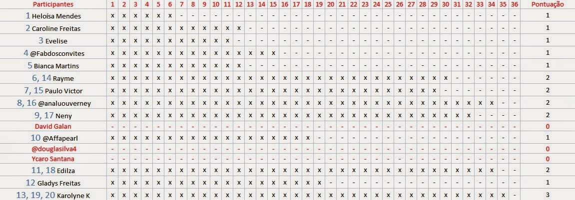 Apenas três pessoas que se inscreveram não comentaram o suficiente para garantir a participação. Fico bem orgulhosa de vocês, haha Apesar de que, só uma pessoa conseguiu os três pontos né?