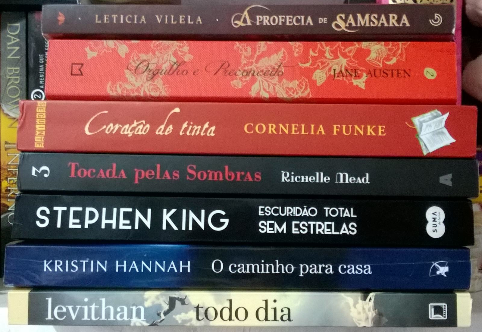 Eu adoro uma pilha nova *-* É bom saber que estou conseguindo diminuir, mesmo que pouco, meus livros não lidos da estante (são mais de 60, gente >.<). A Profecia de Samsara estava na última votação, mas apesar de não ter ganho, ele foi "sorteado" na minha TBR no meu canal. Estou bem curiosa para ler, principalmente por ser um livro lindo e uma fantasia nacional. Lerei Orgulho e Preconceito para o tema do I Dare You desse mês - romance histórico. Tenho muita curiosidade com essa história e estou bem ansiosa para ler esse livro. Coração de Tinta será uma releitura para eu resenhar aqui e eu adoro essa história e estou bem animada para reler. Tocada Pelas Sombras é o terceiro volume de Academia de Vampiros, uma série que estou gostando bastante, apesar do segundo volume ter sido bem sem graça. Escuridão Total Sem Estrelas é um livro de contos de um autor que eu adoro e parecem ser todos muito legais. O Caminho Para Casa está aqui para eu tentar lê-lo mais uma vez, porque nunca consigo chegar nem perto dele. Todo Dia foi o vencedor da votação e finalmente vou lê-lo! \o/