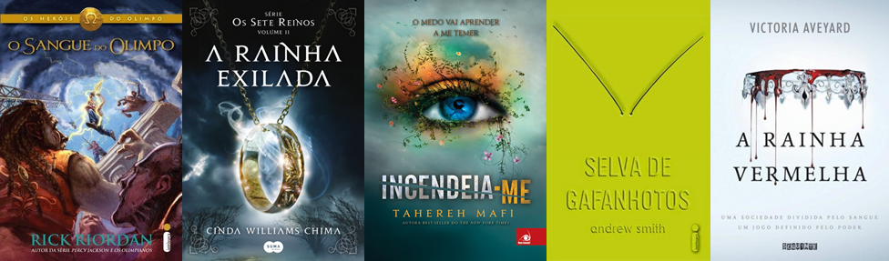 Adoro essa parte da votação! Para essa, escolhi livros que quero muito ler, três deles sendo continuações de séries. O Sangue do Olimpo é o último volume da série Os Heróis do Olimpo e ainda não consegui ler (#shameonme). A Rainha Exilada é continuação de O Rei Demônio e fiquei com muita vontade de continuar a série logo. Incendeia-me é o último volume da trilogia Estilhaça-me, que também estou ansiosa pra ler. Selva de Gafanhotos é um livro que todo mundo tem falado e eu preciso conferir logo! E A Rainha Vermelha, outro que quero muito ler, principalmente pra saber se ficarei no time dos que amaram esse livro ou no time dos que odiaram.