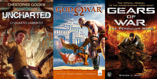 De todos essas capas Uncharted - O quarto Labirinto é o único que quero ler, e gostaria muito mesmo de jogá-lo também, a capa é um pouco confusa, demorei uns segundos pra entender que o fundo é uma cabeça enorme de carneiro incrustada com símbolos e mapas acima de uma floresta ao entardecer, além disso o Nathan Drake pagando de galã na capa é um pouco brega, mas entendo que é para o reconhecimento dos fãs. God of War foi o livro que deu origem