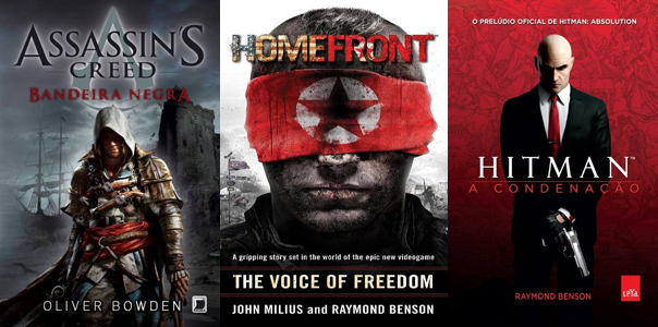 E aqui está o famoso! Assassin's Creed - Bandeira Negra é o sexto jogo em ordem de linha de produção, apesar de estar intitulado com sendo o quarto, por ordem numérica. Todos os livros da série contam a história do jogo, mas sem mencionar os momentos vividos na era presente. As capas são todos razoavelmente parecidas, sem muita criatividade, Bandeira negra foi a que mais gostei, pois podemos ver as ruínas e o navio ao fundo com um ar sombrio, Edward Kenway em primeiro plano com a roupa usual de um Assasin, e a fonte e simbologia comum ao jogo. Eu não conheço HomeFront, só sei que é um jogo de tiro em primeira-pessoa com temática de resistência dos norte americanos que foram invadidos pelos norte coreanos. A capa que é bem elucidativa, gostei principalmente do destaque da bandeiras se unindo no título. A capa de Hitman é simples e prática, e apresenta um ar de refinamento típico do personagem e do jogo.