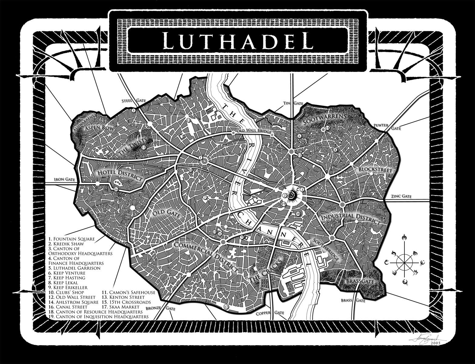 Apesar de estar em preto e branco, esse mapa chama mais a atenção que alguns dos coloridos, pela infinidade de detalhes. Nunca li a trilogia Mistborn, mas já estou com vontade só de olhar para a imagem.