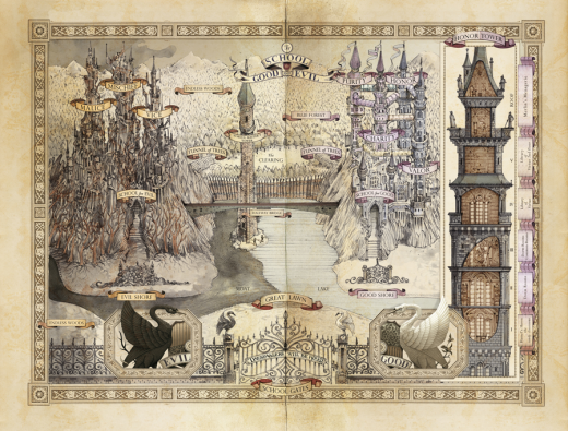 Desde que vi esse mapa pela primeira vez no livro, me apaixonei por ele. É tão bem desenhado que dá vontade de voltar e conferir novamente as torres a cada novo capítulo da trama. Além disso, ajudou muito a compreender melhor o funcionamento das escolas.
