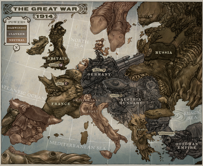 Como não amar a estranheza desse mapa? Pode ser um pouquinho difícil se localizar, porém tenho certeza que ele combina perfeitamente com a trama steampunk criada pelo autor.