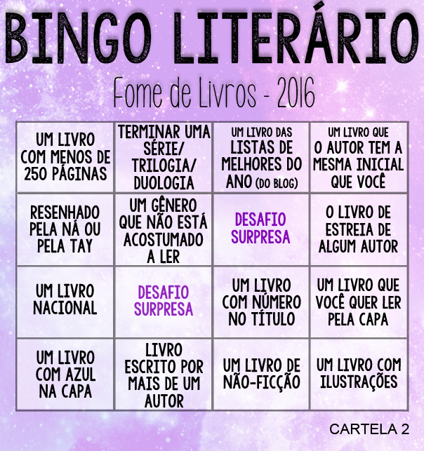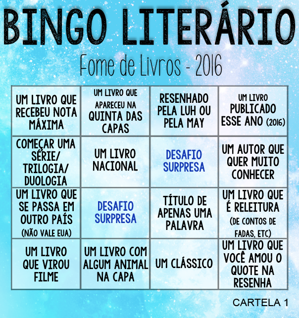 *A maioria dos desafios têm a ver com o blog Fome de Livros. Em desafios como "livro que recebeu nota máxima", "apareceu na quinta das capas", "apareceu na terça do top" e etc, vocês deverão pesquisar livros que apareceram nessas categorias/colunas aqui no blog.