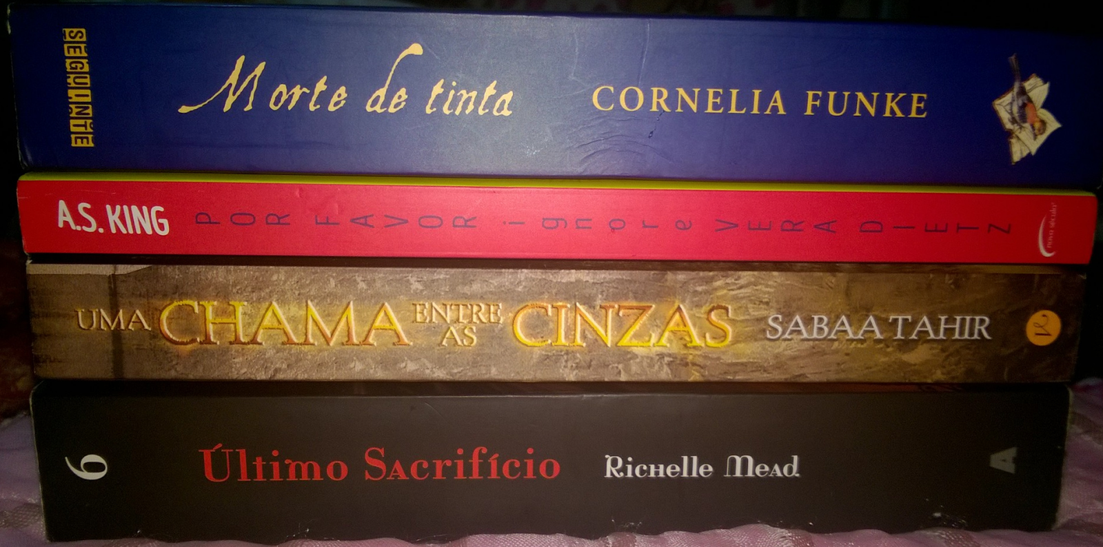 Pois é, fui muito decepcionante. Mas acho que depois de tantas maratonas que eu tentei fazer no ano (algumas consegui participar certinho pelo menos, hahaha), fiquei um pouco "cansada". Ao menos os quatro livros que li foram bons, especialmente Uma Chama Entre as Cinzas, que virou um favorito. Morte de Tinta (que li pouco mais que 100 páginas para terminar) foi uma montanha-russa, e Último Sacrifício fechou bem a série, apesar de algumas coisinhas não terem me agradado tanto. Por Favor, Ignore Vera Dietz é um livro que merece muito ser lido!