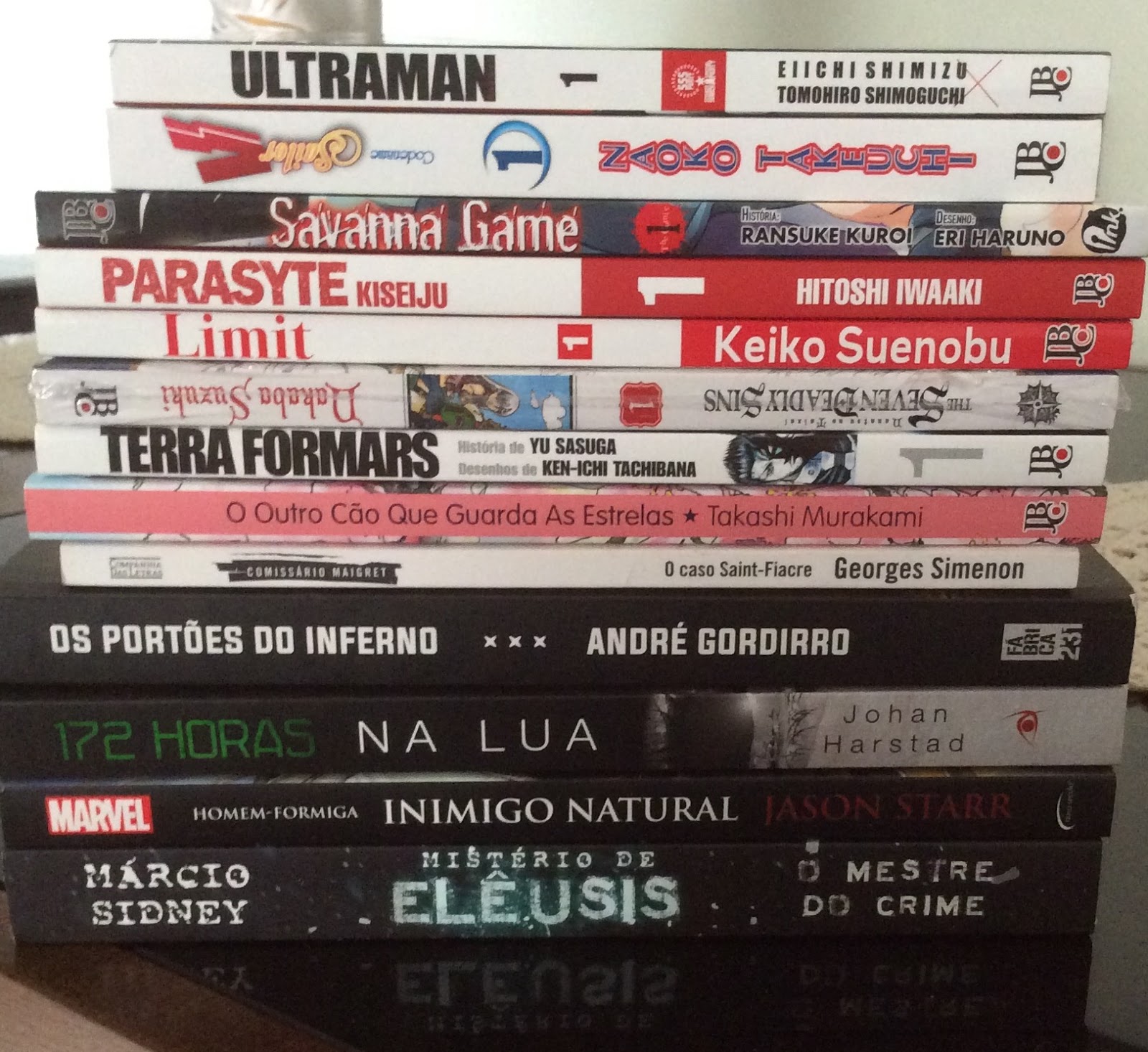 Não gostei de Ultraman, apesar de ser um "clássico", a história não tem apelo e a arte é neutra, nada impressionante. Sailor V foi outra decepção, imaginei ser melhor que Sailor Moon - por ter vindo primeiro, mas depois de ler é óbvio o aperfeiçoamento da história e da arte, está muito além da obra original. Savana Game foi legal, mas não muito cativante. Parasyte foi incrível, super criativo, irônico e de certo modo engraçado. Limit foi uma grande surpresa, eu esperava uma história colegial que iria falar de bullying e a história tomou um rumo completamente diferente e um tanto chocante. Seven Deadly Sins se tornou minha menina dos olhos, há muito tempo que não me interessava tanto por um mangá. Terra Formars teve a melhor arte, e talvez a trama mais intrincada, gostei muito da arte final. Não consegui ler O Outro Cão que Guarda as Estrelas, por que queria ler o anterior da série primeiro. O Caso de Saint- Fiacre foi praticamente uma desilusão, eu lia muito Simenon quando pequena, não imaginava que seria tão ruim lê-lo hoje em dia. Os Portões do Inferno foi uma leitura muito divertida. Tive muitas expectativas sobre 172 Horas na Lua e não foi ruim, mas também não foi tão bom assim. Homem-Formiga: O Inimigo Natural foi muito fraco, a história, os personagens, tudo parecia inacabado - mas a edição estava linda. O mistério de Elêusis está sendo um problema, já o li até a metade e estou empurrando para conseguir terminar..