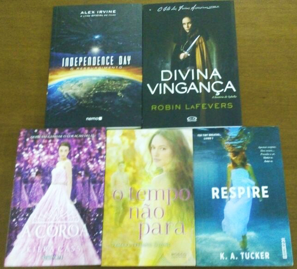 Ok, foto levemente tremida, mas logo vocês vão entender o porquê de estar assim. Sobre os livros, Independence Day 2 (Alex Irvine - Nemo) é uma história talvez conhecida, já que está atualmente com um filme do mesmo nome no cinema. Em breve teremos resenha aqui no blog! Divina Vingança (Robin LaFevers - V&R) já tem resenha aqui no blog, porque eu li a prova antecipada, mas precisava do livro final, já que amei a história!