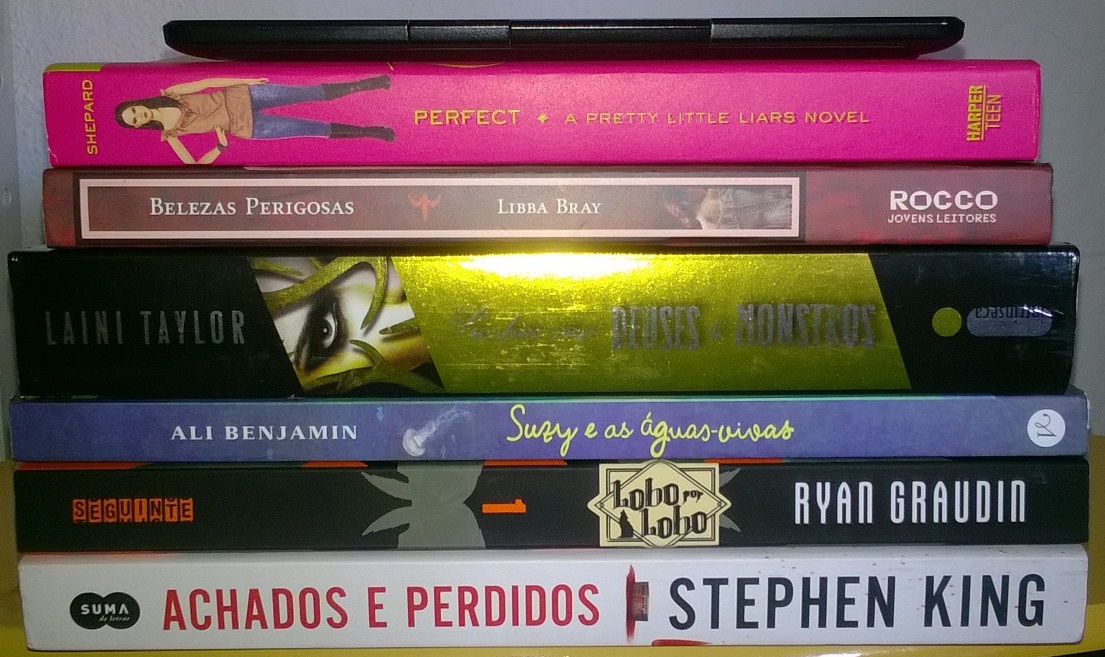 Eu ainda não consigo prever muito bem qual livro lerei em seguida, mas esses são aqueles que eu com certeza lerei em breve. Perfeitas (Perfect) é o terceiro volume de Pretty Little Liars. Belezas Perigosas é o vencedor da última votação. Sonhos Com Deuses e Monstros é o terceiro e último volume da trilogia Feita de Fumaça e Osso - estou ansiosa! Suzy e as Águas-Vivas é um infanto-juvenil que estou bem curiosa por ler. Lobo Por Lobo é da mesma autora de A Cidade Murada (que eu amei) e a premissa desse livro faria qualquer um querer lê-lo pra ontem! Achados e Perdidos é o segundo volume da Trilogia Bill Hodges e eu já o comecei em setembro, mas por algum motivo ainda não consegui avançar muito na leitura, mal passei da página 100. Provavelmente vou ler alguns livros em e-book também, então coloquei meu Kindle ali para representá-los.