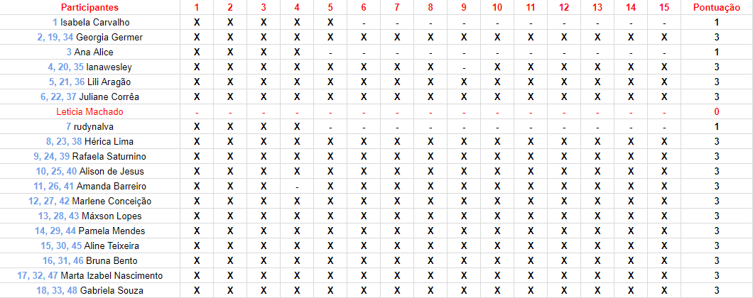 Vamos conferir agora todos os participantes e a pontuação de cada um!