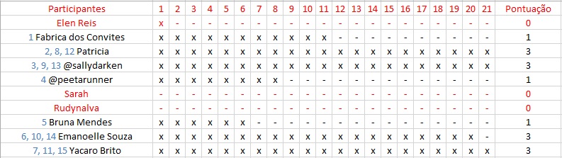 Não vou tecer comentários sobre a falta de participações esse mês. Me recuso! Tratem de marcar presença aqui em Dezembro ou as coisas ficarão feias para o lado de vocês (#maybolada).